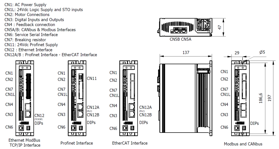 All motors and servomotors with Phase Current up to 5.2A rms.
